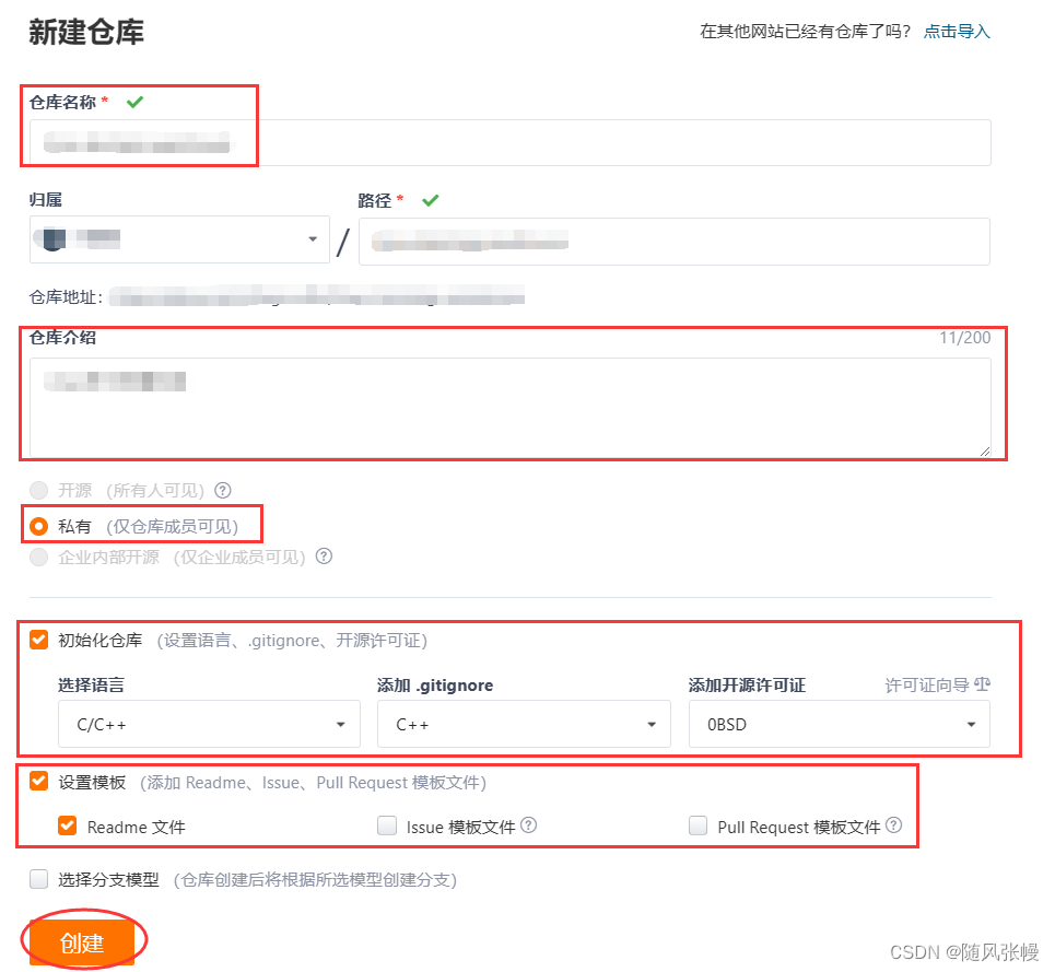 填写仓库名称和仓库介绍,选择私有(现在仅有私有选项),点击初始化仓库,选择所用语言,添加gitignore,选择开源许可证。其中开源许可证随便选择一个即可,而gitignore是用来对上传文件进行筛选的,通常我们只需要上传.h、.c、.cpp的源文件即可,我们可以将其他临时文件的后缀添加到gitignore模板中,这样就上传的时候就会进行筛选,不会再上传与添加到gitignore模板中后缀相同的文件。