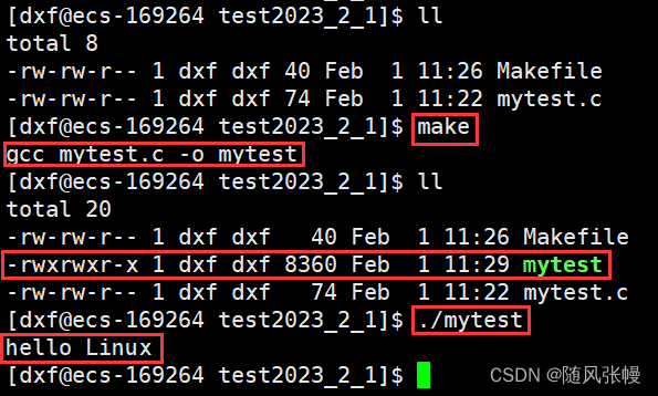 6.makefile文件中内容如下图一所示,多次调用make指令,只有第一次会帮助我们生成全新的mytest目标可执行程序,从第二次开始系统告诉我们mytest已经是最新的目标可执行程序了,不能再生成了。此时如果我们直接多次调用gcc命令,那么每次使用gcc命令还是会重新生成目标可执行文件,如下图二所示。这就说明是makefile在起作用,如果makefile内目标可执行程序没有被.PHONY修饰,那么如果makefile识别到生成的目标可执行程序是最新的就不会再重新生成了。
