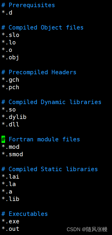 5.本地中,在以gitee仓库名为名称的目录中有一个.gitignore隐藏文件,如下图一所示,凡是与.gitignore文件中后缀相同的文件都禁止进入本地git仓库,也就禁止将其提交到远端gitee上,因此vim .gitignore打开该文件,可以看到有很多后缀内容,如下图二所示。