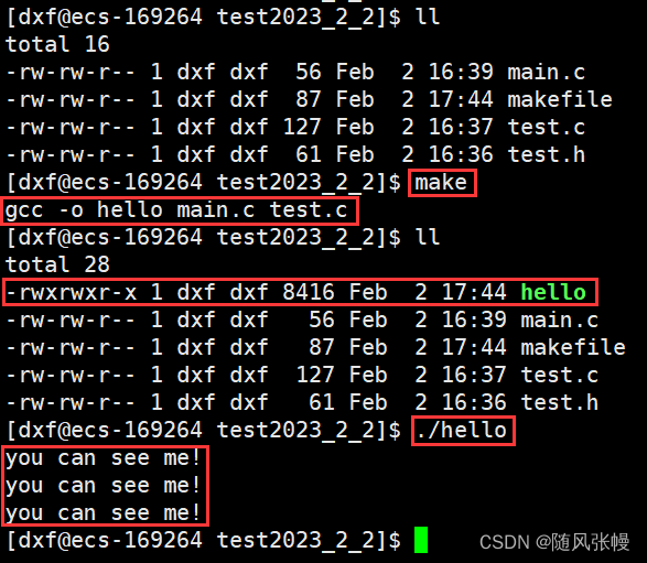 项目目录中有了Makefile文件中的依赖关系和依赖方法,那么我们如果想编译目录中的文件就不需要再使用gcc命令了,直接使用make命令即可,如下图所示,make之后自动就会生成对应的可执行程序。