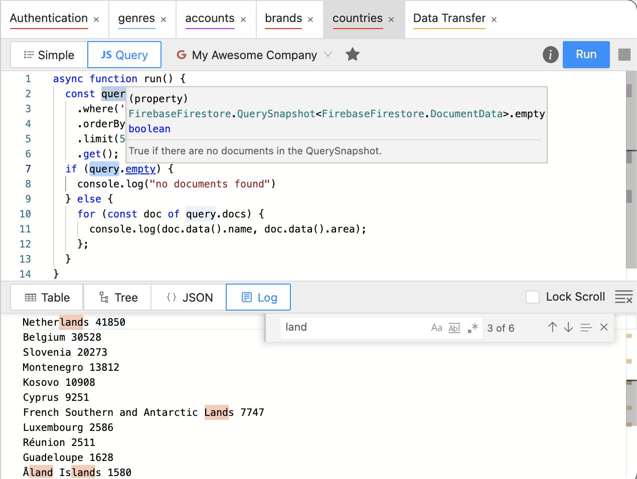 »使用 JavaScript 编写自定义 Firestore 查询,无需设置即可读取、写入和删除数据。自动完成和语法高亮由熟悉的 VS Code 编辑器提供。