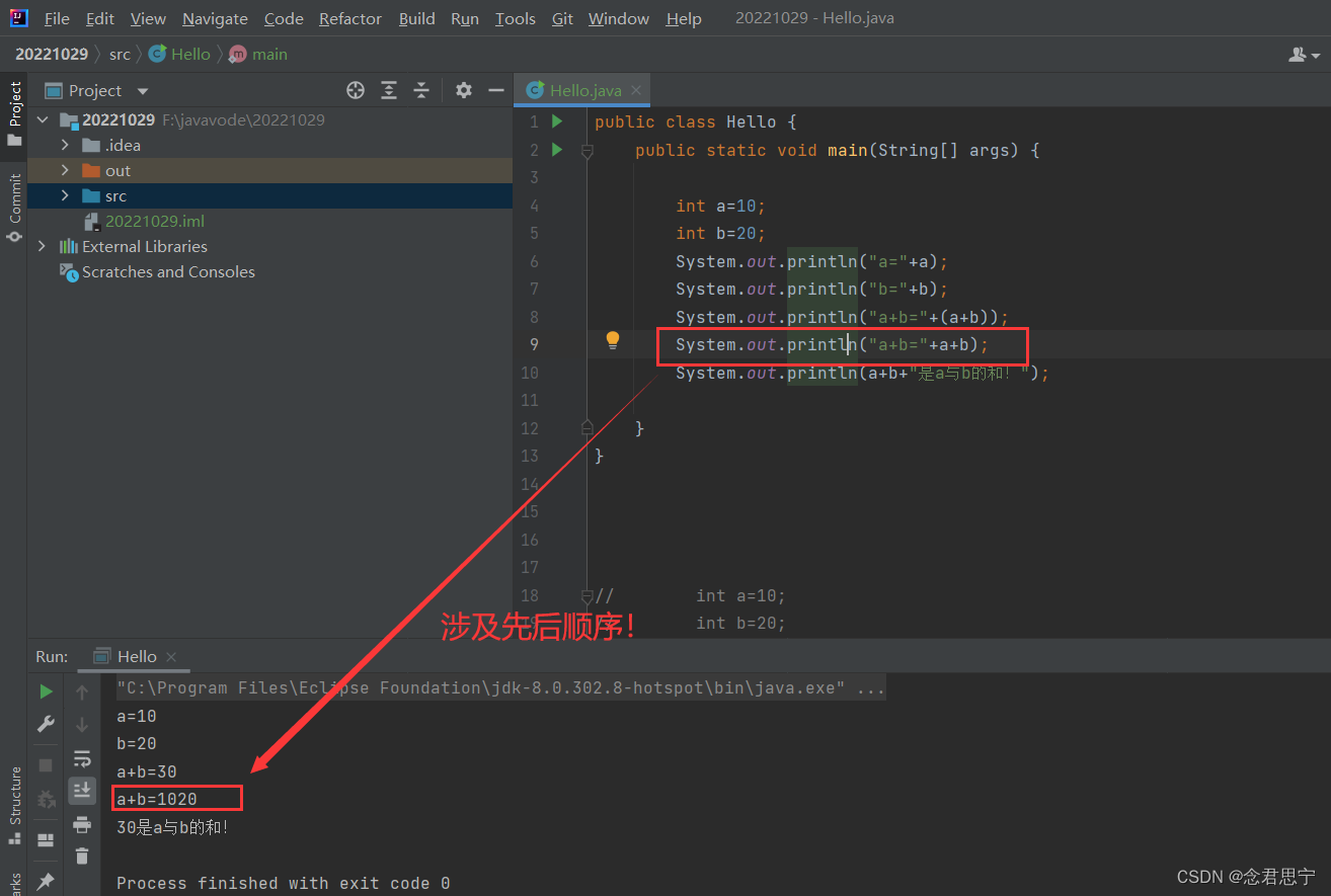 但是,有了疑惑??为什么将: System.out.println("a+b="+(a+b)); 中的输出语句加了括号??这个答案是显而易见的:我们想要输出a+b的最后的结果!!!涉及先后顺序!!