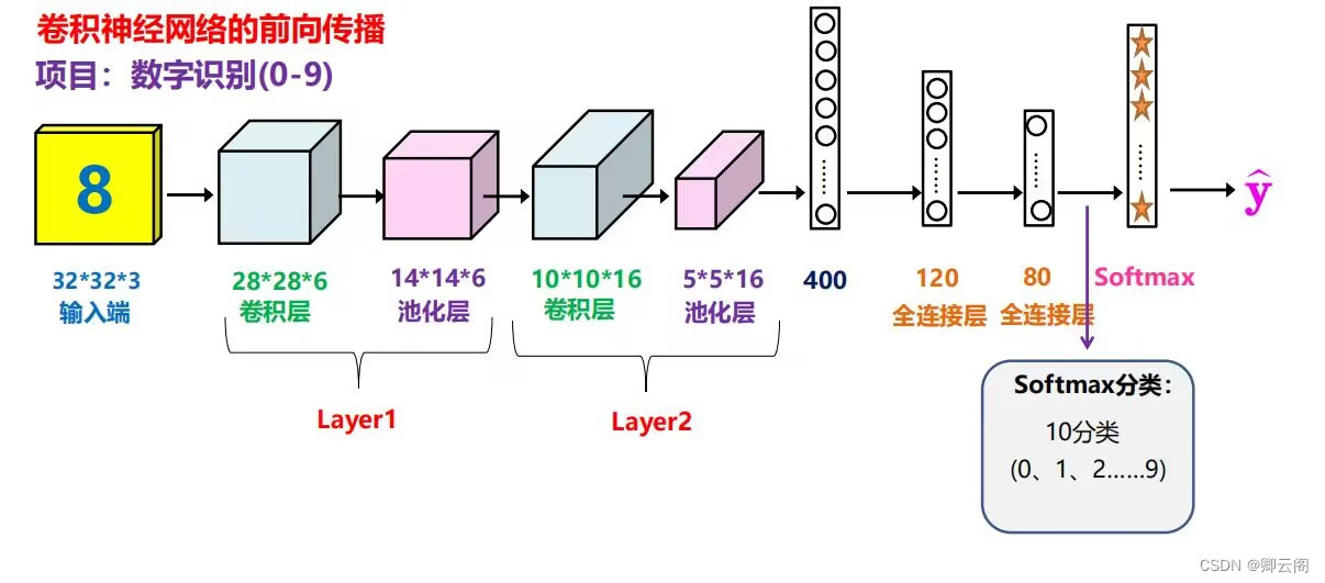 一开始图像以32*32*3的大小作为输入端,经过6个5*5的卷积核,步长为1的卷积操作得到28*28*6的特征图,然后经过2*2的池化核,步长为2的池化操作得到14*14*6的特征图,再经过16个5*5的卷积核,步长为1的卷积操作得到10*10*16的特征图,然后经过2*2的池化核,步长为2的池化操作得到5*5*16的特征图,再将特征图展开得到1*400的一维向量,再经过全连接层和分类器得到概率。