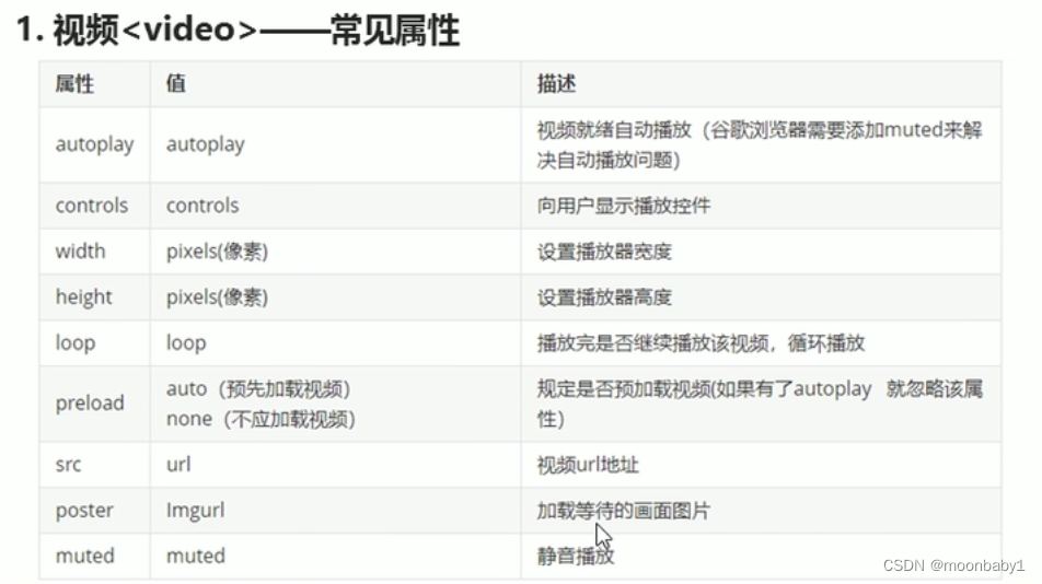 视频标签是重点,我们经常设置自动播放,不使用controls控件,循环和设置大小属性