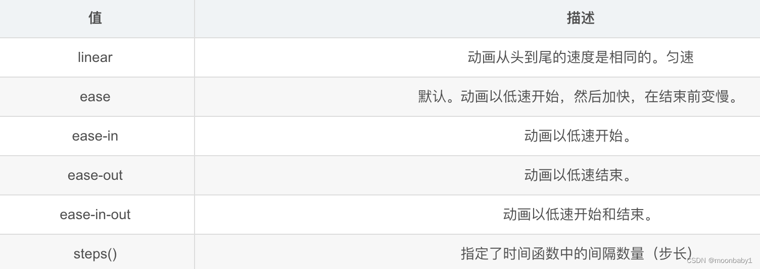 animation-timing-function:规定动画的速度曲线,默认是“ease”