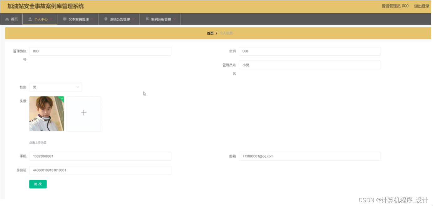 个人中心,在个人信息页面中可以填写管理员账号、密码、管理员姓名、性别、头像、手机、邮箱、身份证等信息进行修改,如图5-9所示。