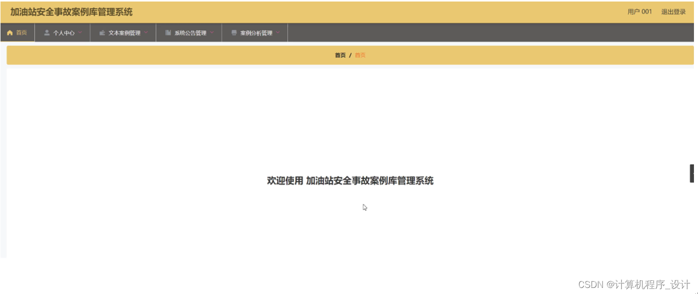 用户登录进入加油站安全事故案例库管理系统可以查看首页、个人中心、文本案例管理、系统公告管理、安全分析管理等信息,如图5-13所示。