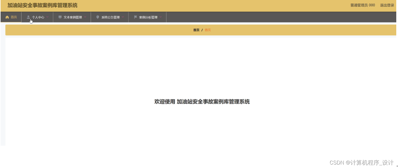 普通管理员登录进入加油站安全事故案例库管理系统可以查看首页、个人中心、文本案例管理、系统公告管理、案例分析管理等信息,如图5-8所示。