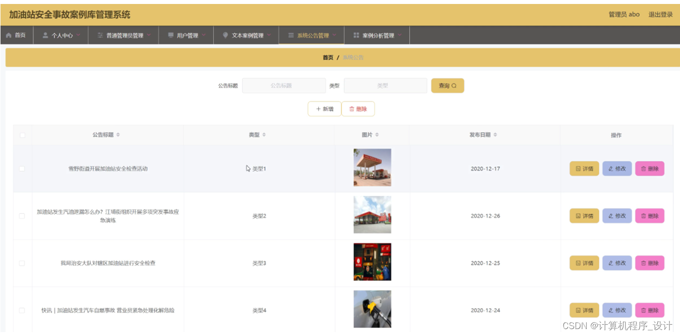 系统公告管理,在系统公告管理页面中可以查看公告标题、类型、图片、发布日期等内容,并且根据需要进行修改或删除等详细操作,如图5-6所示。