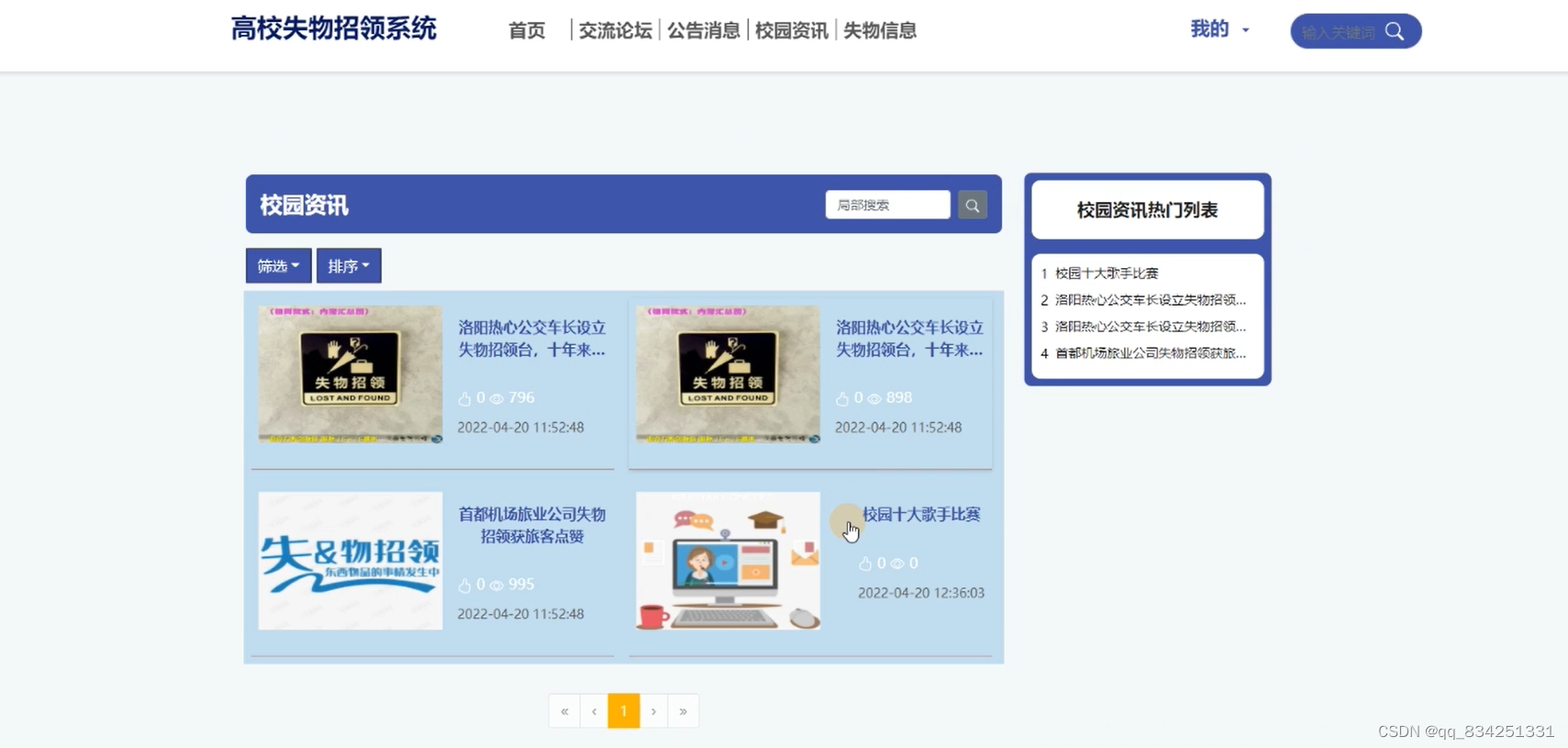 高校失物招领系统主要功能模块包括轮播图,公告栏,管理员,用户,交流论坛,论坛分类,校园资讯,资讯分类,失物分类,失物信息,联系我们等,采取面对对象的开发模式进行软件的开发和硬体的架设,能很好的满足实际使用的需求,完善了对应的软体架设以及程序编码的工作,采取MySQL作为后台数据的主要存储单元,采用SpringBoot框架、Java技术、Ajax技术进行业务系统的编码及其开发,实现了本系统的全部功能。本次报告,首先分析了研究的背景、作用、意义,为研究工作的合理性打下了基础。针对高校失物招领系统的各项需求以及技术问题进行分析,证明了系统的必要性和技术可行性,然后对设计系统需要使用的技术软件以及设计思想做了基本的介绍,最后来实现高校失物招领系统和部署运行使用它。