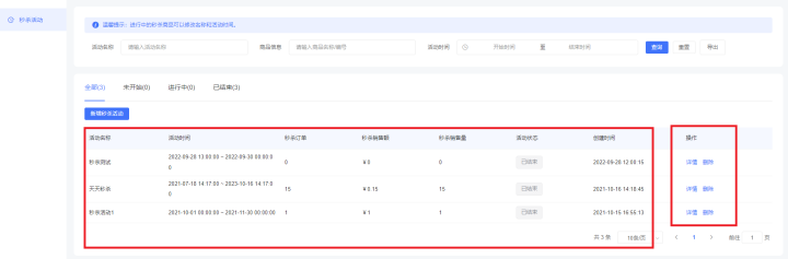 平台管理可以输入活动名称、商品名称/编号、活动时间等查询搜索活动,如下图所示: