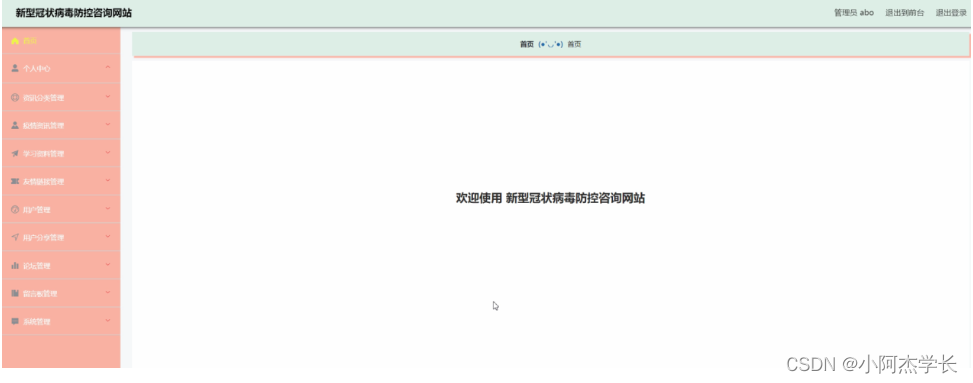 管理员登录进入新型冠状病毒防控咨询网站可以查看首页、个人中心、资讯分类管理、疫情资讯管理、学习资料管理、友情链接管理、用户管理、用户分享管理、论坛管理、留言板管理、系统管理等信息进行详细操作,如图4-7所示。