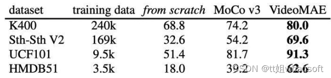 在无需使用任何额外数据的条件下,VideoMAE在Something-Something V2 和Kinetics-400 上的 Top-1 准确率分别达到75.4%和87.4%。需要注意的是,Something-Something V2数据集上目前最佳的方法都强烈依赖于在外部数据集上进行预训练的模型进行初始化。相反,VideoMAE在没有利用任何外部数据的条件下能够显着优于之前的最佳方法的准确率约 5%。VideoMAE在Kinetics-400 数据集上也能取得非常卓越的性能。在视频数据有限的情况下(例如,UCF101 数据集中仅包含不到1万个训练视频, HMDB51 中仅包含约3500个训练视频),VideoMAE不需要利用任何额外的图像和视频数据,也能够在这些小规模视频数据集上远远超过之前的最佳方法。