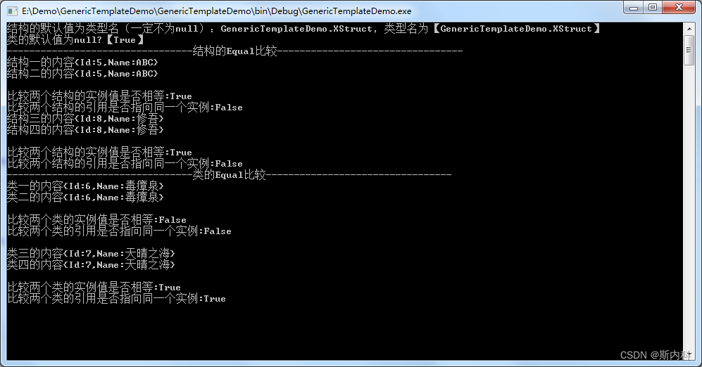 - Console.WriteLine($"比较两个结构的实例值是否相等:{xStruct1.Equals(xStruct2)}");