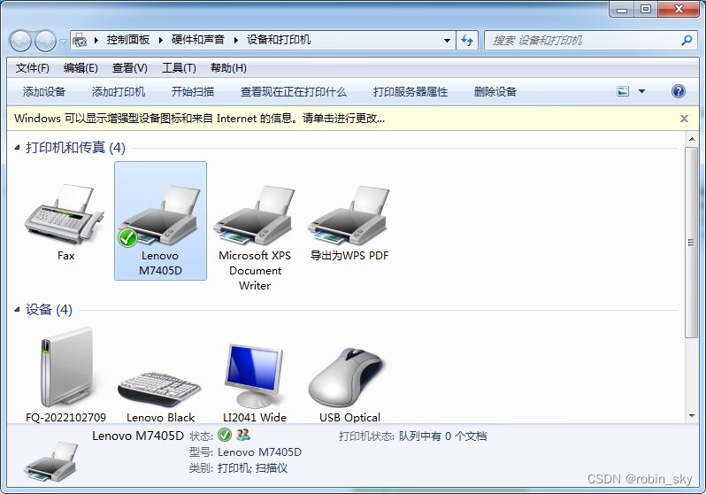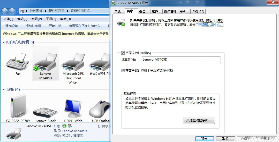第二步、接下来打印机共享怎么设置了。以联想M7405D功能一体机为例说明。在已经连接了打印机的电脑上进行以下操作: