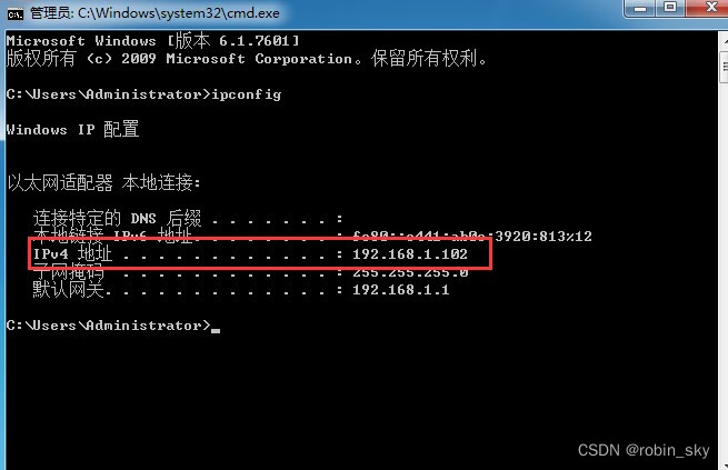 2:然后在弹出界面内输入“ipconfig”,然后敲击回车按键,下面就会显示这台电脑的IP地址。如下图: