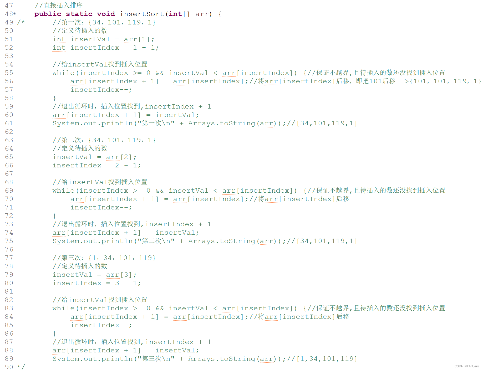 arr[insertIndex + 1] = arr[insertIndex];//将arr[insertIndex]后移
