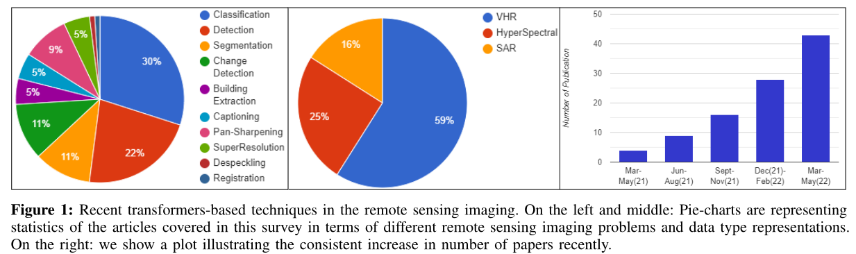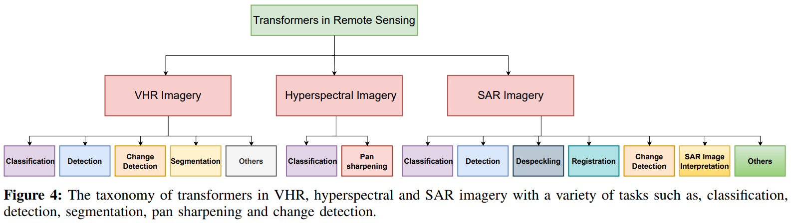与上述调查不同的是,我们的工作回顾了基于变压器的方法在遥感热门领域的最新进展。据我们所知,这是第一次全面介绍变压器在遥感方面的情况,特别是在甚高分辨率、高光谱和合成孔径雷达图像分析方面的进展。