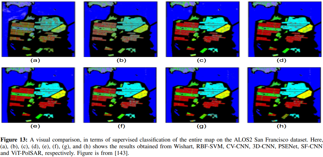 准确地对SAR图像中的目标类别进行分类是一个具有挑战性的问题,具有许多现实世界的应用。最近,人们探索了用于SAR图像的自动解译和目标识别的转换器。[143]的工作探索了用于极化SAR(PolSAR)图像分类的视觉转换器。在该框架中,将图像块的像素值作为特征,利用自注意机制获取长距离依赖关系,然后使用多层感知器(MLP)和可学习类特征来集成特征。在该框架内使用了对比学习技术以减少冗余并执行分类任务。图12显示了该框架的概述,图13给出了监督分类方面的定性比较。