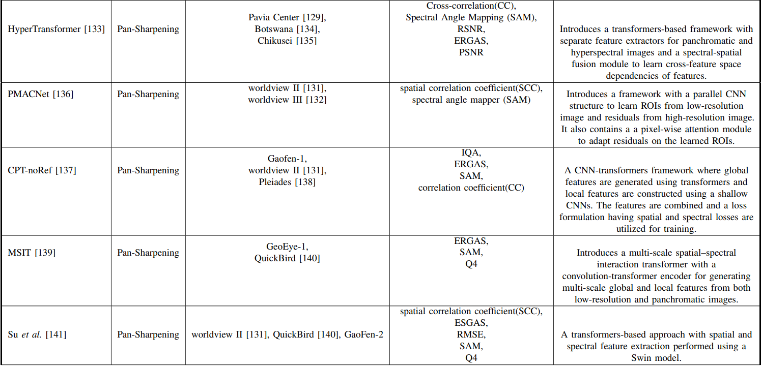 在高光谱全色锐化问题中,任务是利用配准的全色图像的空间信息对低分辨率的高光谱图像进行空间增强,同时保持低分辨率图像的光谱信息。全息锐化在遥感中的各种任务中扮演着重要的角色,包括分类和变化检测。此前,基于CNN的方法在这项任务中显示出了令人振奋的结果。最近,通过利用有用的全局上下文信息,基于转换器的方法已经对这个问题取得了良好的效果。由[139]提出的多尺度空间光谱相互作用变换MSIT包括一个卷积变换编码器,用于从低分辨率和全色图像中提取多尺度局部和全局特征。[137]的工作引入了一种体系结构,其中全局特征使用变压器构建,局部特征使用浅层CNN计算。同时学习以金字塔方式提取的这些多尺度特征。该方法进一步引入了同时考虑空间损失和频谱损失的损失公式,用于使用真实数据进行训练。梁等人。[136]提出了一种PMACNet框架,在该框架中,低分辨率图像的感兴趣区域和回归到高分辨率图像的残差都在并行的CNN结构中学习。然后,基于学习到的感兴趣区域,利用像素方式的注意模块来调整残差。