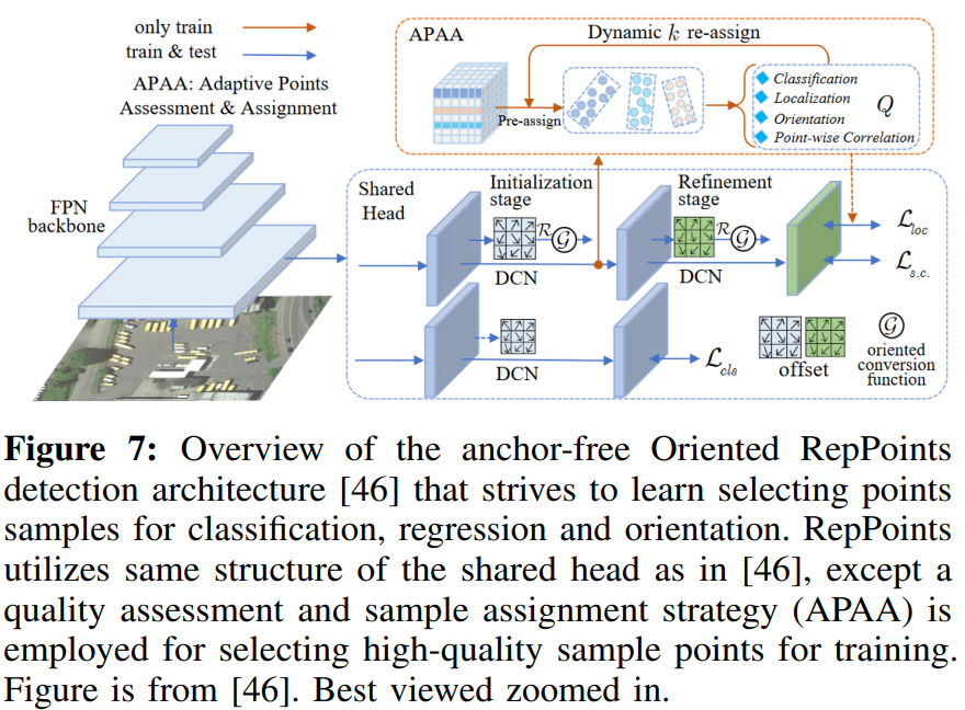 张某等人。[43]介绍了一种将深度可分卷积的局部特性与MLP的全局(信道)特性相结合的混合架构。[44]的工作引入了一个两级无角度检测器,其中RPN和回归都是无角度的。他们的工作还评估了建议的基于变压器主干的检测器(Swin-Tiny)。刘等人。[45]提出了一种称为TransConvNet的混合网络结构,旨在通过聚合全局和局部信息来结合CNN和转换器的优点,以更好地关注上下文来解决CNN的旋转不变性。此外,设计了一种自适应特征融合网络,用于从多个分辨率获取信息。[46]的工作介绍了一种检测框架,称为定向Rep-Points,它利用灵活的自适应点作为表示。提出的无锚点学习方法从分类、定位和定向三个方面学习选择点样本。具体地说,为了学习任意定向空中目标的几何特征,引入了一种质量评估和样本分配方案,该方案测量和识别用于训练的高质量样本点,如图7所示。此外,他们的方法利用空间约束来惩罚位于定向框之外的样本点,以实现点的稳健学习。