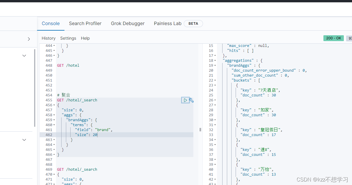 GET /hotel/_search { "query": { "range": { "price": { "gte": 10, "lte": 200 } } }, "size": 0, "aggs": { "brandAggs": { "terms": { "field": "brand", "size": 10, "order": { "_count": "desc" } } } } }总结:
