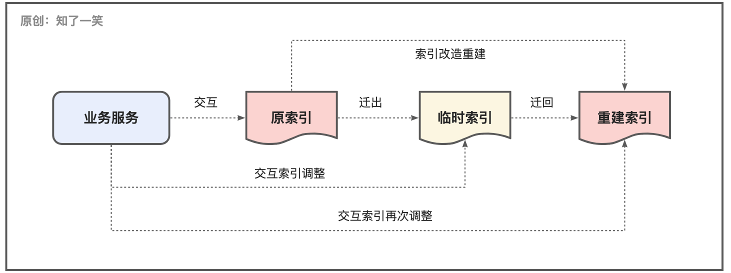ES实践中一个非常经典的问题,修改索引的结构时需要进行索引重建,此时要将当前索引迁入临时索引中,在完成索引结构调整之后,需要从临时索引中迁回数据,在此过程中,可以对服务交互的索引名称动态调整;