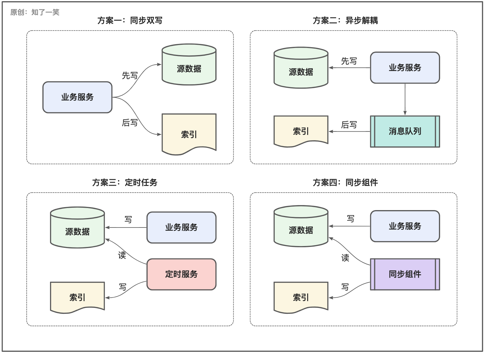 数据同步的选型方案有多种,如何选择完全看具体的场景,在过往的使用过程中,对于核心业务会采用同步双写,对于内部的活动类业务会采用异步的方式,对于业务日志会采用任务调度,对于系统的监控或执行日志则多是依赖同步组件;