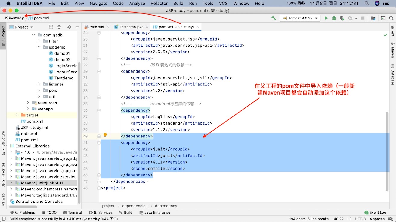 若还未导入依赖可以按快捷键Option+Enter,选择导入相应的依赖。会自动添加依赖配置到pom文件中,并且自动下载相应jar包。(Maven项目的pom文件,点这里复习一下)