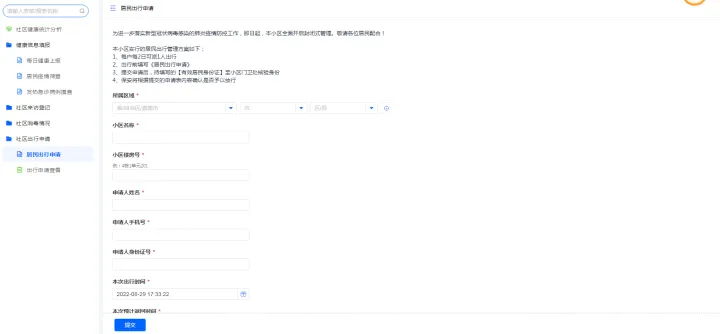 当社区根据需求进入封闭式管理后,为了落实集中管理,如有特殊情况需要外出必须向社区提出申请,社区需要对申请人做必要的信息筛查,登记后方可允许外出。