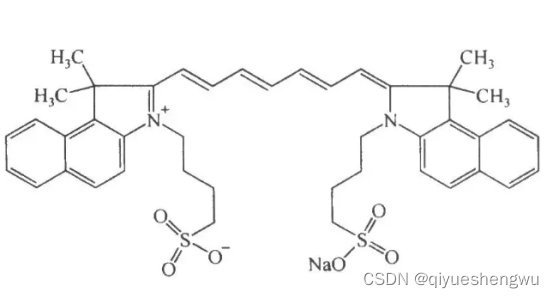 ICG是一种带负电荷的聚甲基菁染料,跟CY3,CY5,CY7这些菁染料不同的是他有这更高的吸收和发射波长,它的波长是800nm