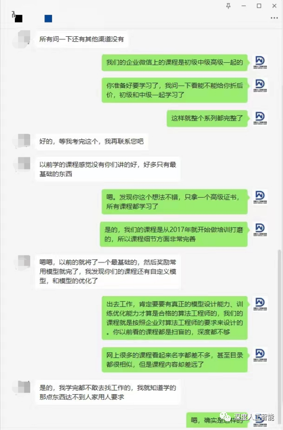 除了专业的课程内容外,还有课程学习中的技术答疑服务,以及考前集训。有报名老师督促学习进度,以及考试安排,有专业教学老师负责课程内容答疑。直接省去了很多不必要的学习麻烦,让学习变得随心所欲,不但可以随时随地可以学习,还有专业老师工作时段全天候的实时答疑。下面是来自学员对深度人工智能教育课程的反馈: