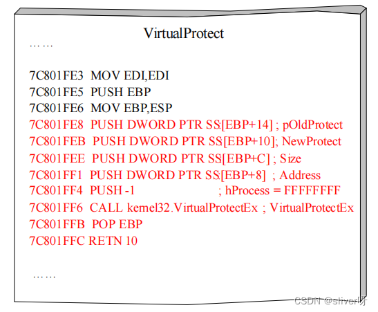 如果retn 4 之后,程序准备调用函数VirtualProtect(),那么四个参数位置就是上图红框框的四个位置。