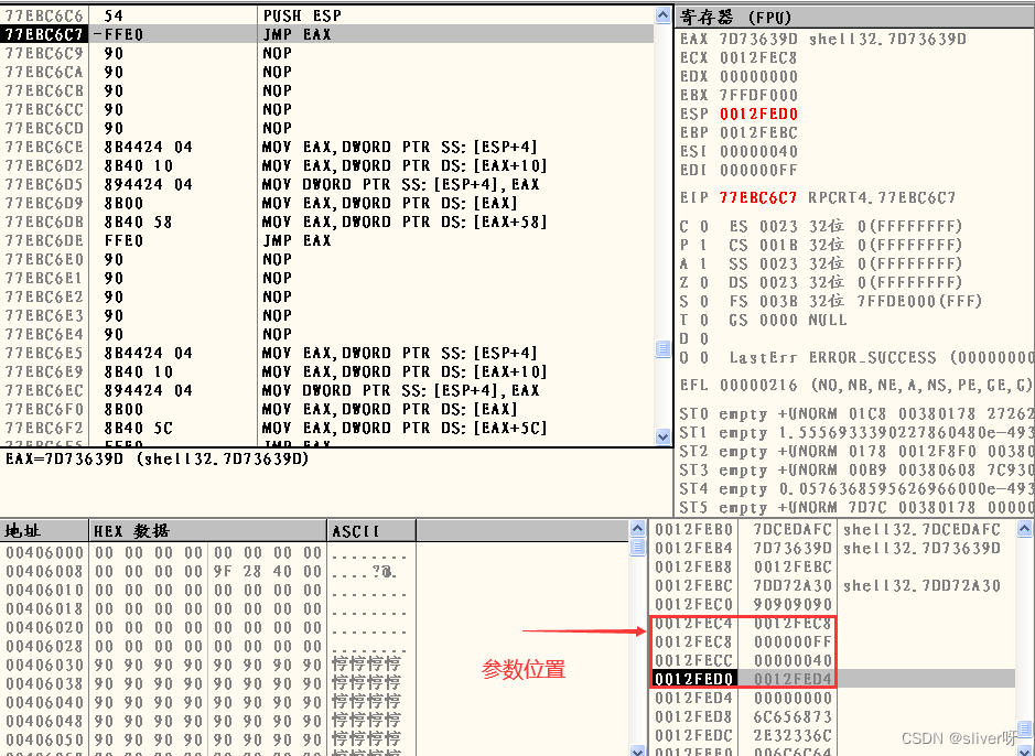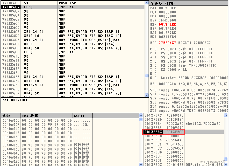 可以发现,函数VirtualProtect()的第二、三参数应该分别放在0x0012FEC8、0x0012FECC处,也就是在构造shellcode的时候,将函数VirtualProtect()的第二、三参数直接布置在"\xC6\xC6\xEB\x77"后面即可。