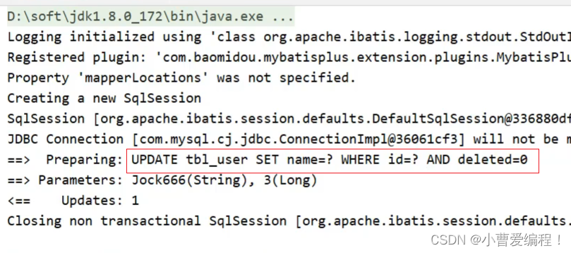 @SpringBootTest class Mybatisplus03DqlApplicationTests { @Autowired private UserDao userDao; @Test void testUpdate(){ //1.先通过要修改的数据id将当前数据查询出来 User user = userDao.selectById(3L); //version=3 User user2 = userDao.selectById(3L); //version=3 user2.setName("Jock aaa"); userDao.updateById(user2); //version=>4 user.setName("Jock bbb"); userDao.updateById(user); //verion=3?条件还成立吗? } }运行程序,分析结果: