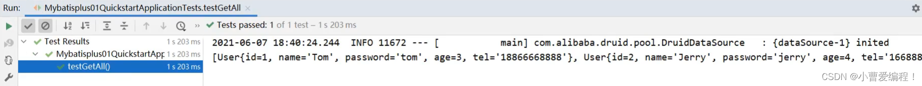 @SpringBootTest class Mybatisplus01QuickstartApplicationTests { @Autowired private UserDao userDao; @Test void testGetById() { User user = userDao.selectById(2L); System.out.println(user); } }2.6 查询所有