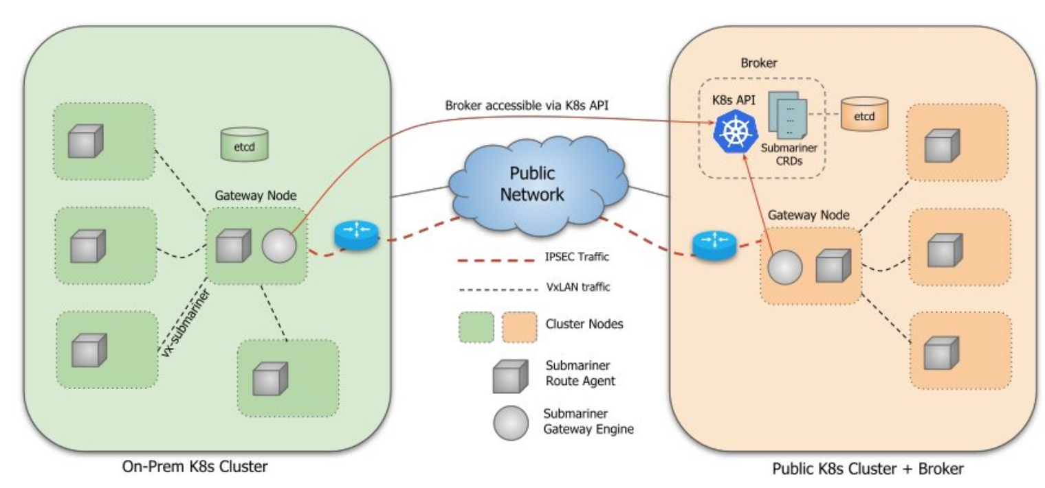 CNCF 有个沙箱项目叫 Submariner,它通过在不同集群建立不同的网关节点并打通隧道的形式实现多集群通信。从官方这张架构图来说明: