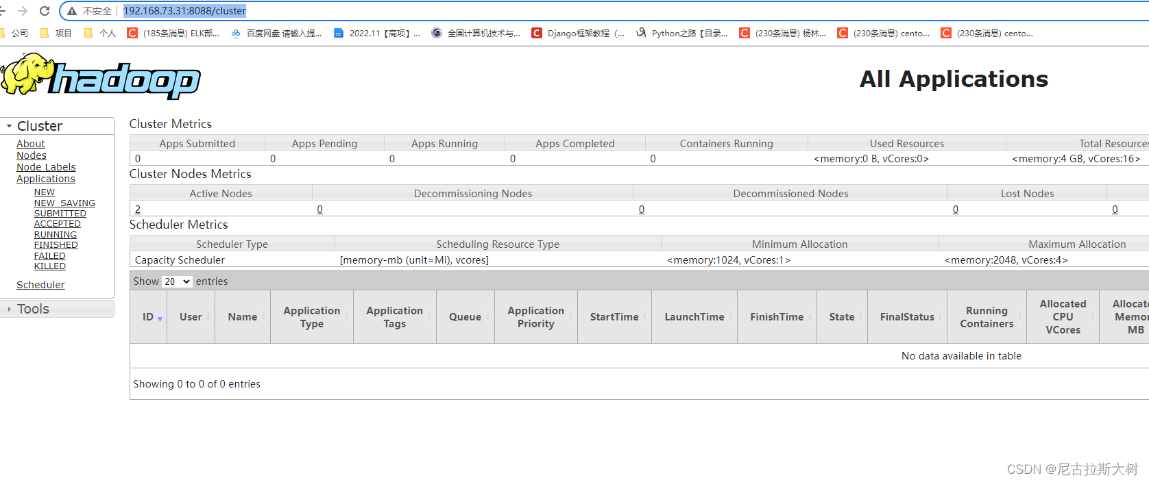 访问resourcemanager http://192.168.73.31:8088/cluster