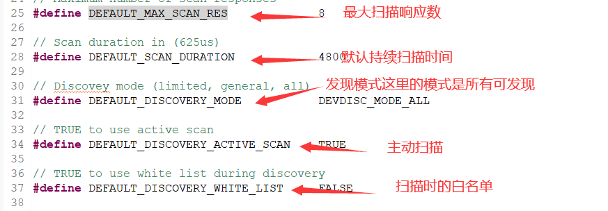 uint8_t mode:发现模式 uint8_t activeScan:如果为TRUE执行主动扫描 uint8_t whiteList:仅扫描白名单中的设备