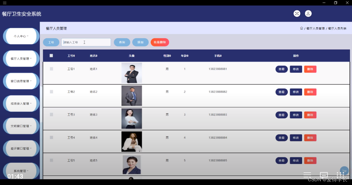餐厅人员管理,在餐厅人员管理页面可以对工号,姓名,头像,性别,年龄,手机等信息进行查看,修改和删除等操作,如图5-8所示。