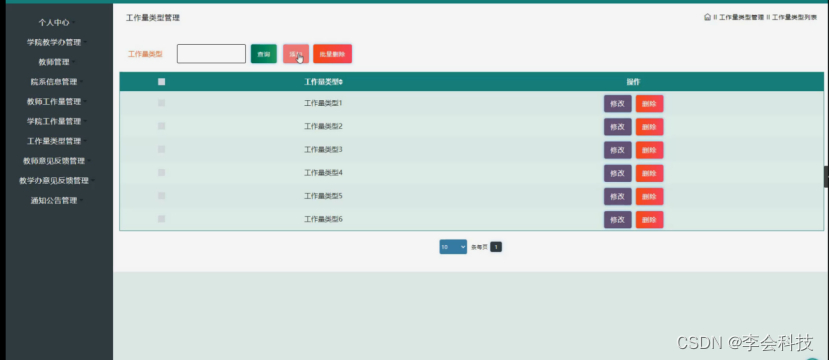 3、功能的完善性:可以管理个人中心、学院教学办管理、教师管理、院系信息管理、教师工作量管理、学院工作量管理、工作量类型管理、教师意见反馈管理、教学办意见反馈管理、通知公告管理模块的修改维护操作。