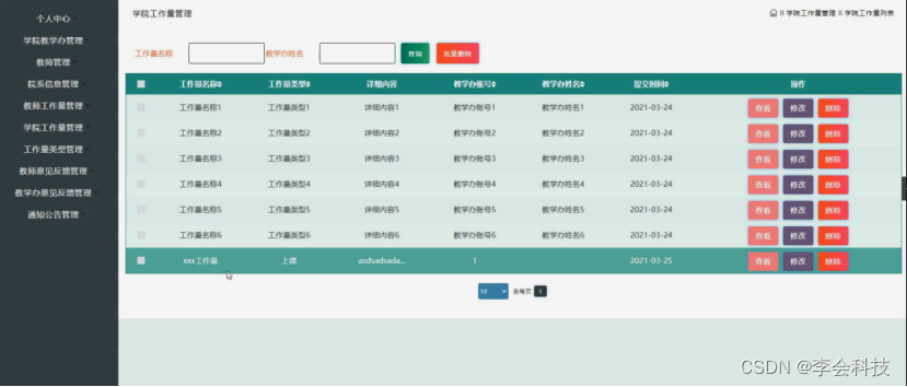 教师工作量管理,在教师工作量管理页面中可以对工作量名称、工作量类型、详细内容、教学办账号、教学办姓名、提交时间等信息进行查看、修改或删除等操作,如图5-6所示。