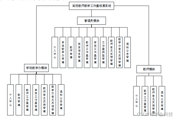 (1)功能要求:可以管理个人中心、学院教学办管理、教师管理、院系信息管理、教师工作量管理、学院工作量管理、工作量类型管理、教师意见反馈管理、教学办意见反馈管理、通知公告管理等功能模块。