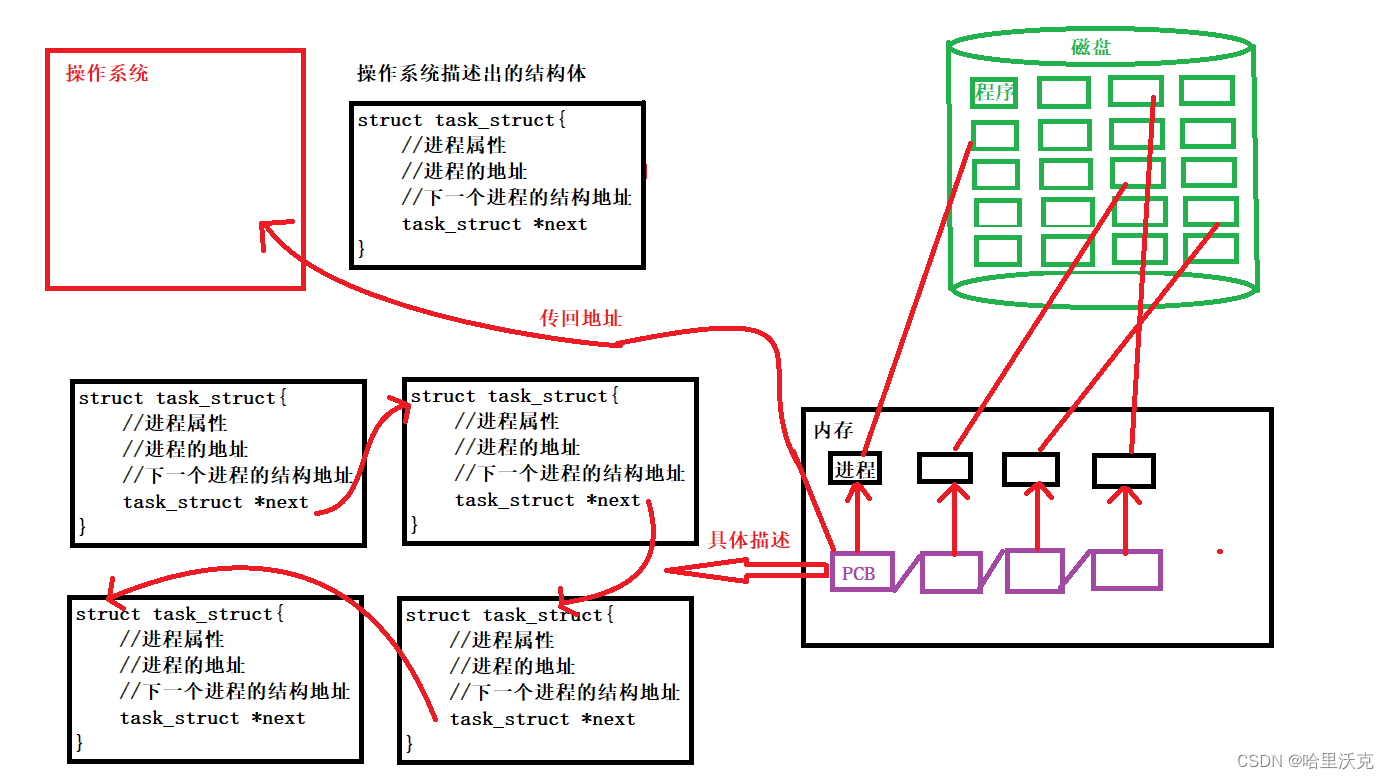 那么我们知道,程序都是先存储在磁盘里的,想要变成进程必须进入到内存中。那么内存也有很多的进程需要加载,这时就需要操作系统进行组织管理,所以操作系统又需要对所谓的硬盘中的数据进行描述再组织。那么操作系统为了描述进程引出PCB的概念。