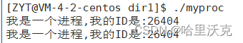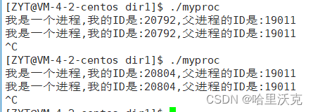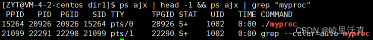2.过滤其他进程名,我们得到两个关于该程序的进程,上面的是执行myproc的代码,下面的是grep找myproc的执行代码。