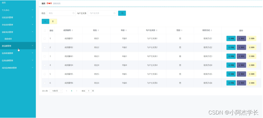 家庭成员管理,在家庭成员管理页面可以查看索引、成员编号、姓名、年龄、与户主关系、性别、联系方式等信息,并可根据需要进行详情、修改或删除等操作,如图4-6所示。