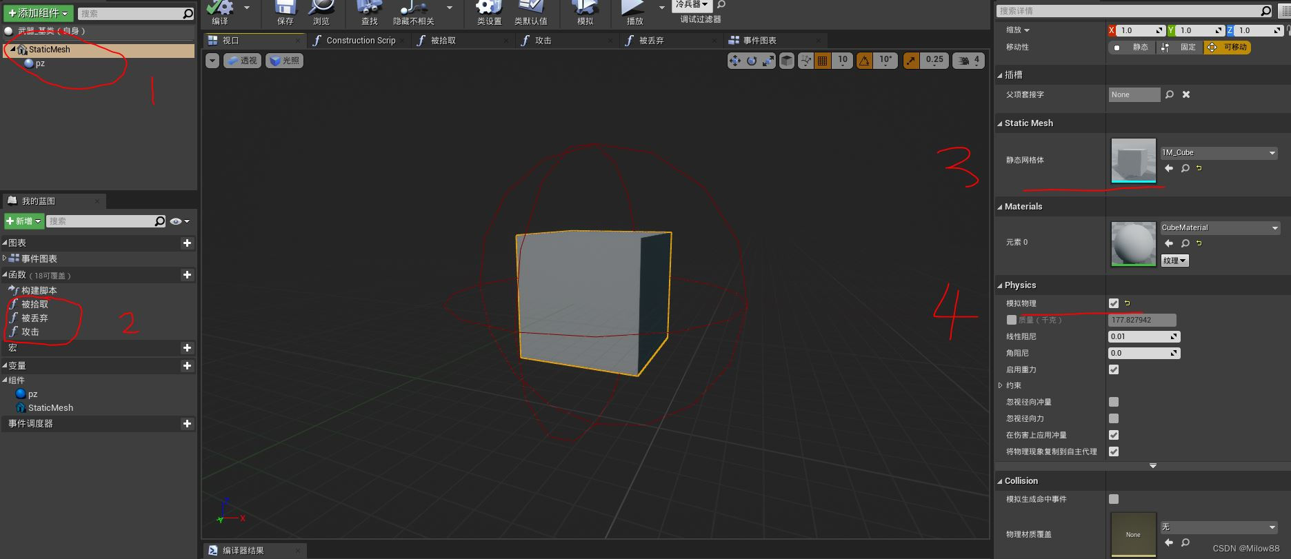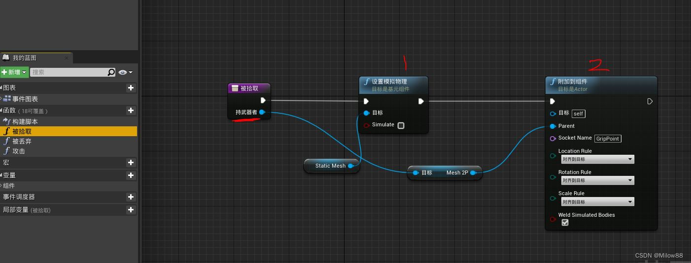 被拾取主要实现两个效果:关闭模拟物理和附加到人物类下的mesh 2P组件下的一个插槽中。