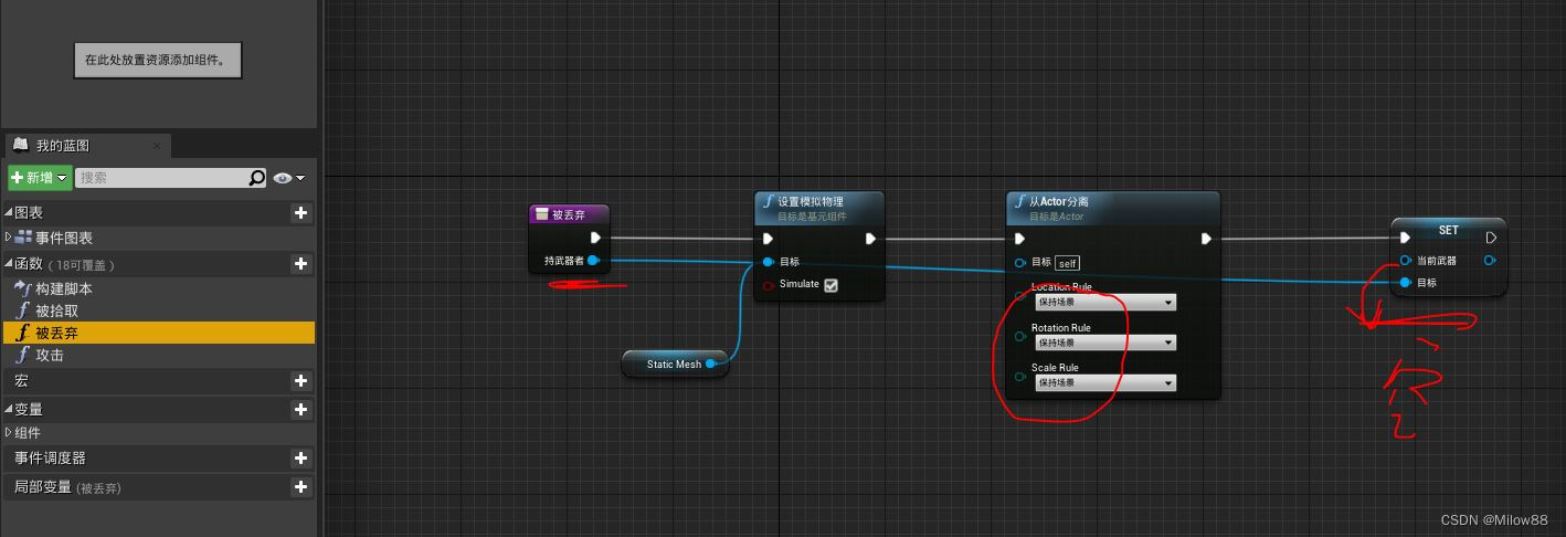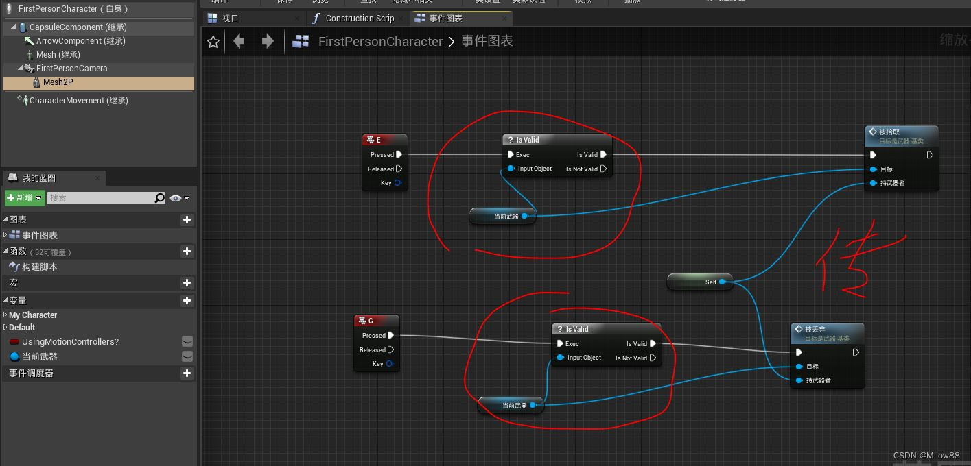 两个is Valid用来防止人物不在武器区域时不能触发拾取函数,手上没武器时不能触发丢弃函数。