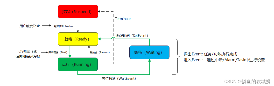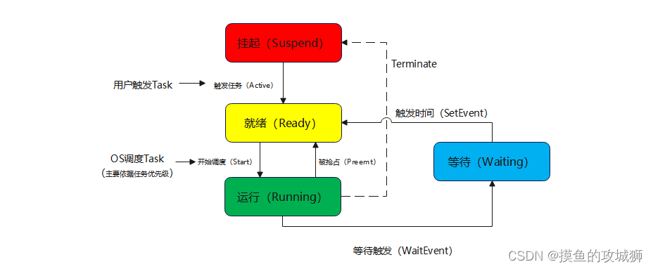 扩展任务存在四种状态:准备(Ready)、运行(Running)、挂起(Suspend)、等待(Waiting)。与基础任务显著区别是可以进入阻塞状态,也就是可以等待OS的事件,并且一般不会回到挂起状态。基本过程为:Suspend-> Ready-> Running-> waiting-> Ready (循环)