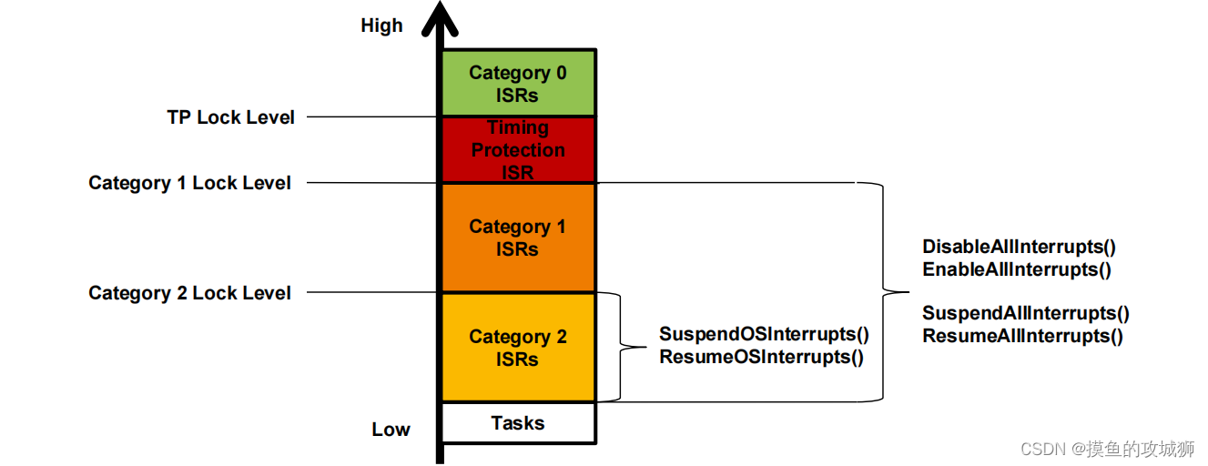 在整个系统中Task的优先级最低,对于时间保护类中断以及Category 0通常以错误勾子函数(ErrorHoook)形式处理,用户可以操作的两种中断类型为:一类中断、二类中断,除此之外提供了可以禁用两类中断的接口函数(可通过禁用中断防止执行过程被打断,常被用于资源保护等场景)。